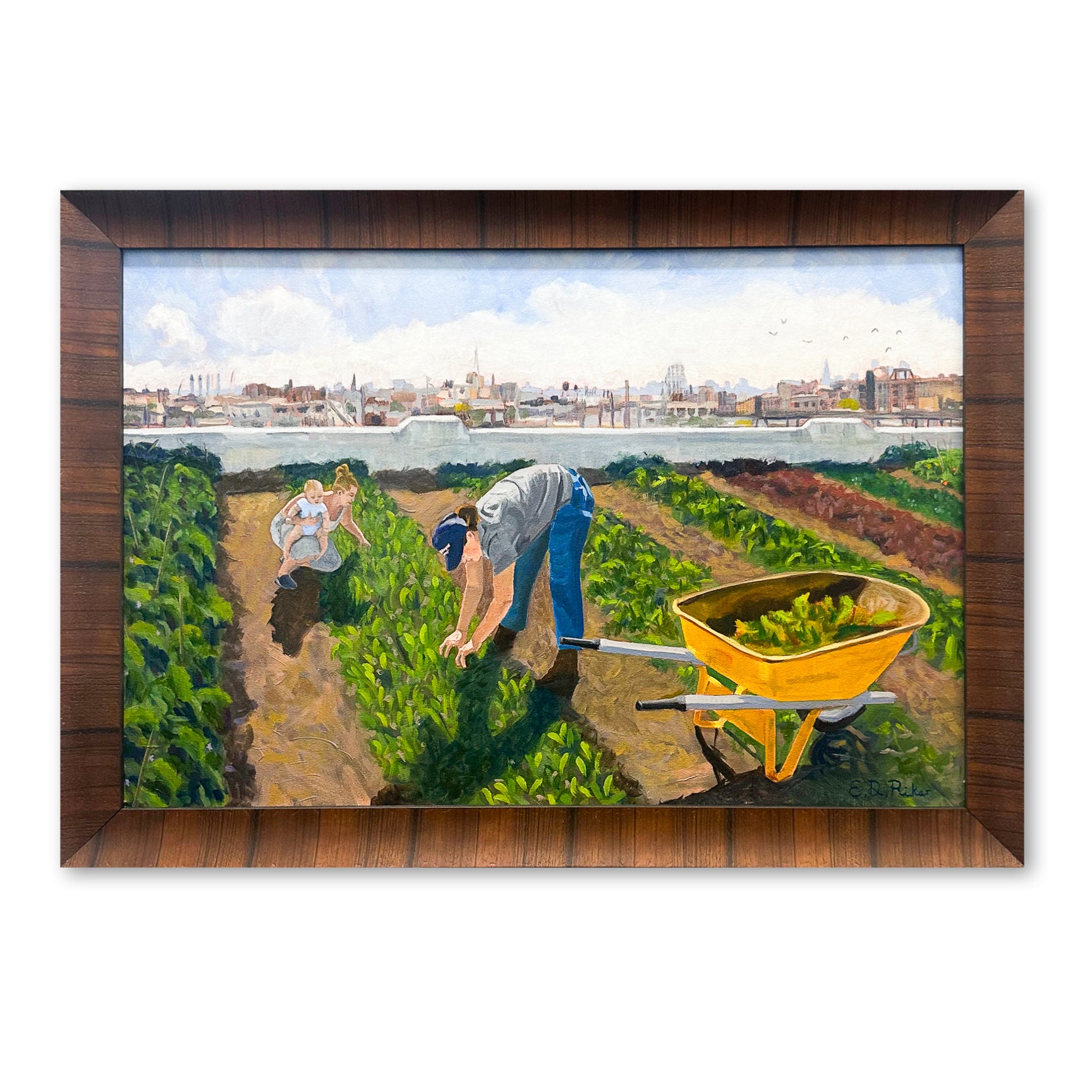 Elizabeth Downer Riker is an American realist painter and New York resident. Born in Boston, raised on a barge in Paris and inspired by her time in New Mexico, Elizabeth translated her passion for painting the people and open landscapes of New Mexico to the rooftop farms of New York, juxtaposed by the city sprawl.